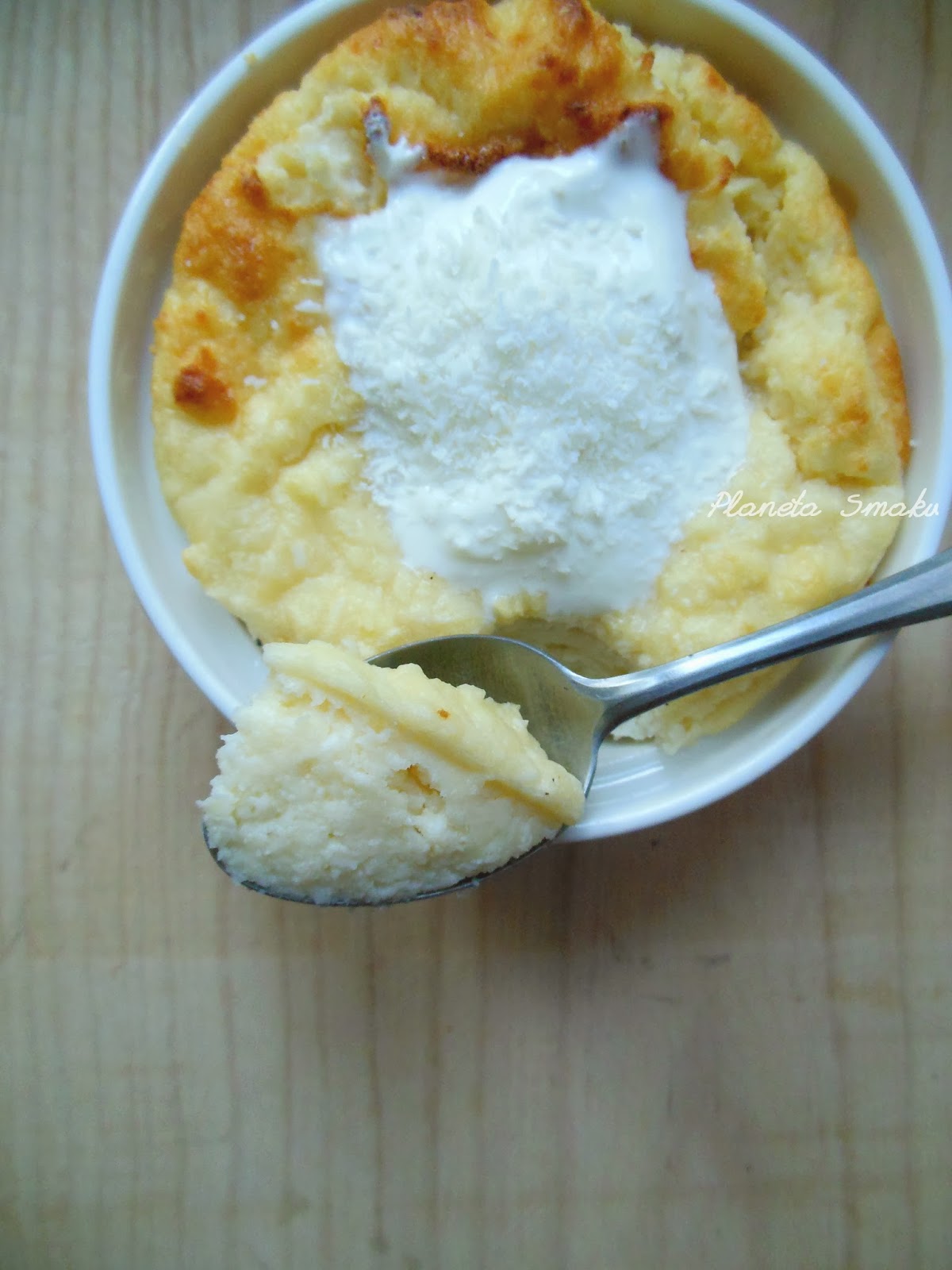 Chociaż zimy za oknem nie widać, moje śniadanie kojarzy mi się ze śnieżnym puchem. Nie ma się co dziwić – biel twarogu, kaszy manny, wiórek kokosowych i migdałów sprawia, że całość wygląda jak lekki i puszysty śnieg. Zapach znanej pralinki unoszący się z piekarnika sprawił, że błyskawicznie poczułam się głodna. Oparłam się jednak pokusie i wystudziłam mój serniczek w lodówce, gdzie spędził całą noc. A jak smakował rano? Jak mój ulubiony sernik – kremowy, ale dość zbity. Takie lubię najbardziej! To jak, może skusisz się na odrobinę (całkiem zdrowej) przyjemności?