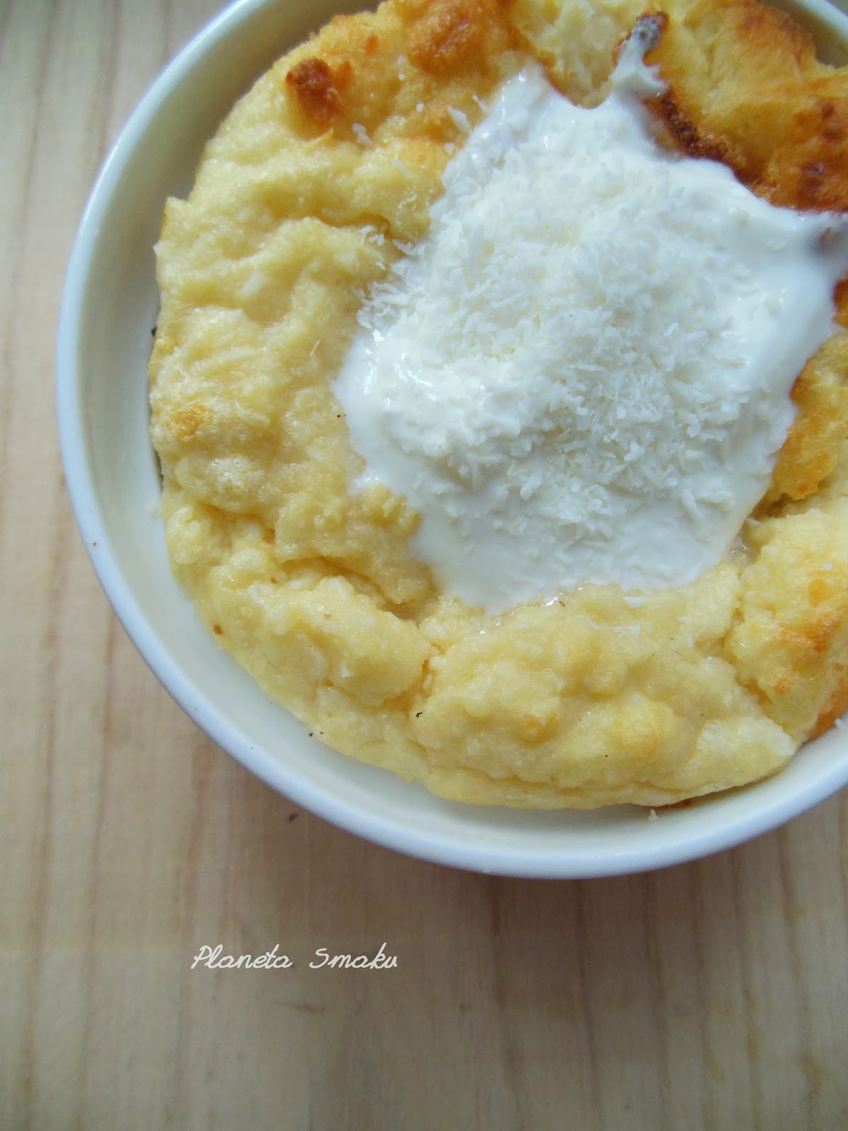 Białko jajka ubić na sztywną pianę. Do chłodnej kaszy dodać twaróg i żółtko, zmiksować. Całość połączyć delikatnie z ubitą pianą, wymieszać łyżką. Przełożyć do wysmarowanej masłem kokilki, wstawić do piekarnika i piec przez ok. 20 minut w 180 stopniach. Wystudzić, schłodzić w lodówce.