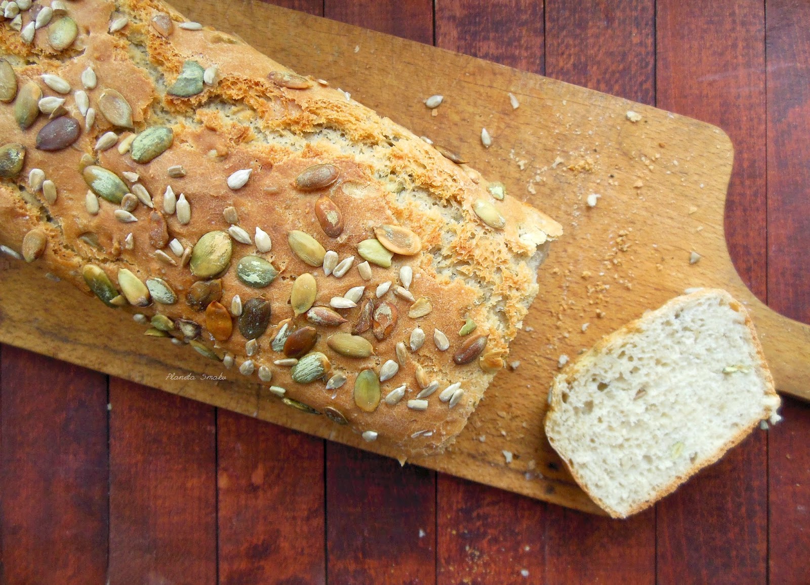 Ten przepis powstał zupełnie spontanicznie. Po prostu – wyjęłam drożdże, mąkę, wodę i wszystko to wymieszałam, nie wiedząc, czy proporcje są w porządku. Czasem jednak intuicja dobrze podpowiada…i niespodziewanie upiekłam bardzo dobry chleb. Nie kruszy się, ma elastyczny środek i zawiera dużo dobroci: mąkę orkiszową, mąkę gryczaną, pestki dyni i słonecznika. Mój własny, chrupiący bochenek.