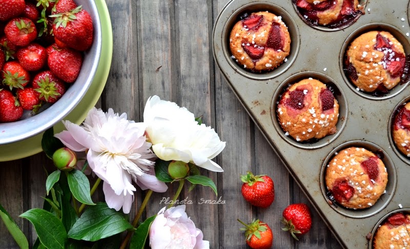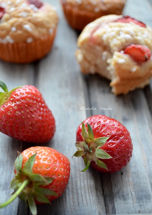 Nakładać po łyżce do przygotowanych foremek na muffiny, do każdej wcisnąć przekrojone na ćwiartki truskawki. Posypać cukrem perłowym. Wstawić do nagrzanego piekarnika (180 stopni) i piec przez 20 minut, do zrumienienia.