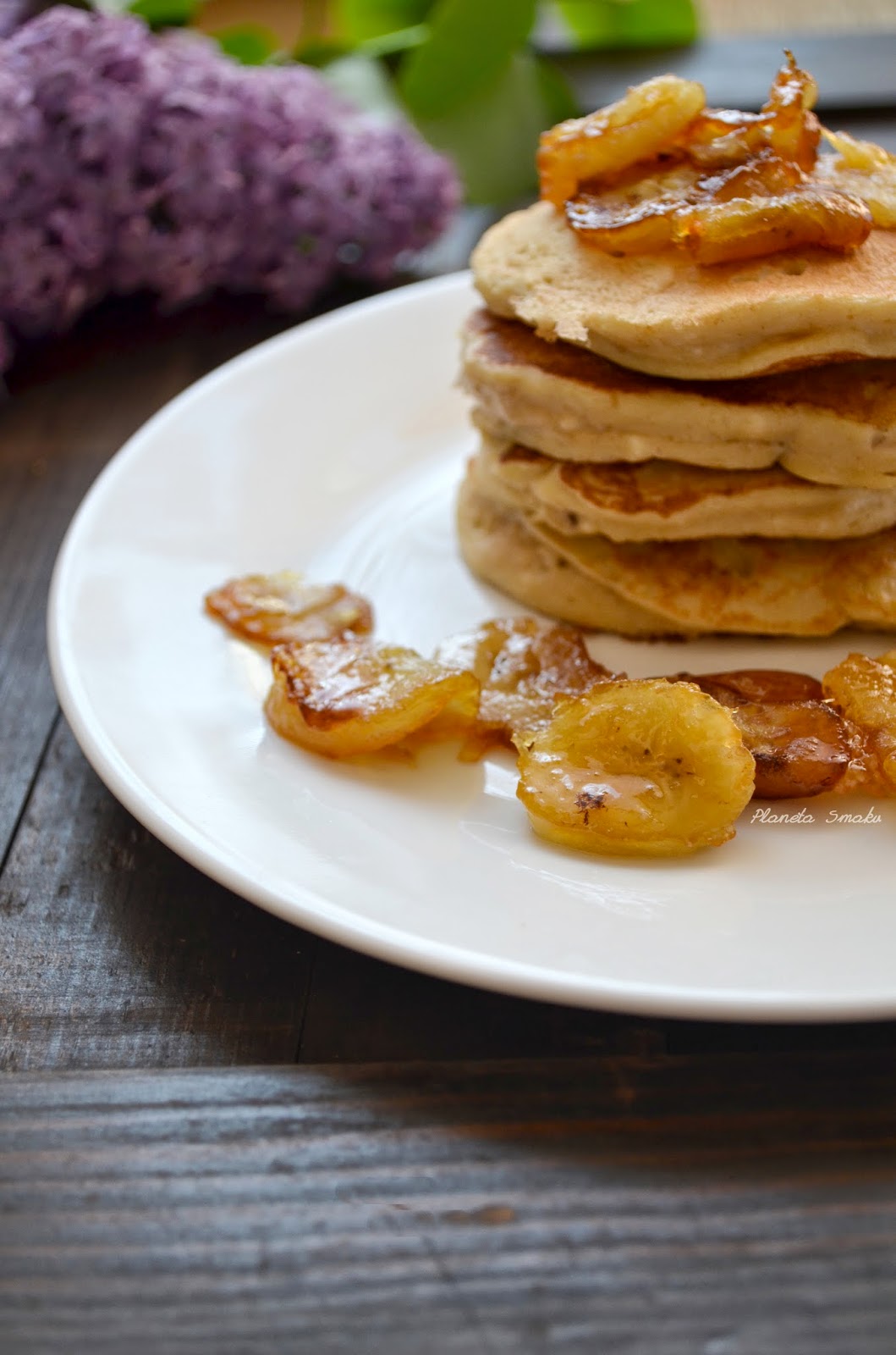 Na suchą patelnię wsypać cukier. Gdy zacznie się karmelizować, okrężnym ruchem rozprowadzić go po całej patelni. Pozostałą połówkę banana pokroić w plasterki, ułożyć na karmelu. Smażyć przez pół minuty, delikatnie przewracając owoce na drugą stronę. Ostrożnie udekorować nimi placuszki. Podawać od razu.