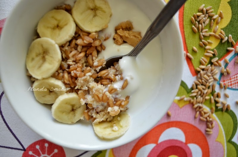 Spróbowałam go zmielić, ale mój blender za nic w świecie nie chciał rozdrobnić twardych ziarenek. Zgodnie ze wskazówkami na opakowaniu, zrobiłam więc inaczej – przepłukałam orkisz, zalałam zimną wodą i odstawiłam na noc do napęcznienia. Rano zalałam świeżą wodą i ugotowałam do miękkości (ok.15 minut). Następnie odcedziłam (wodę zostawiłam sobie do przemywania twarzy, pełen recykling! :D) i tak przygotowany orkisz zjadłam w towarzystwie jogurtu, banana i masła orzechowego.