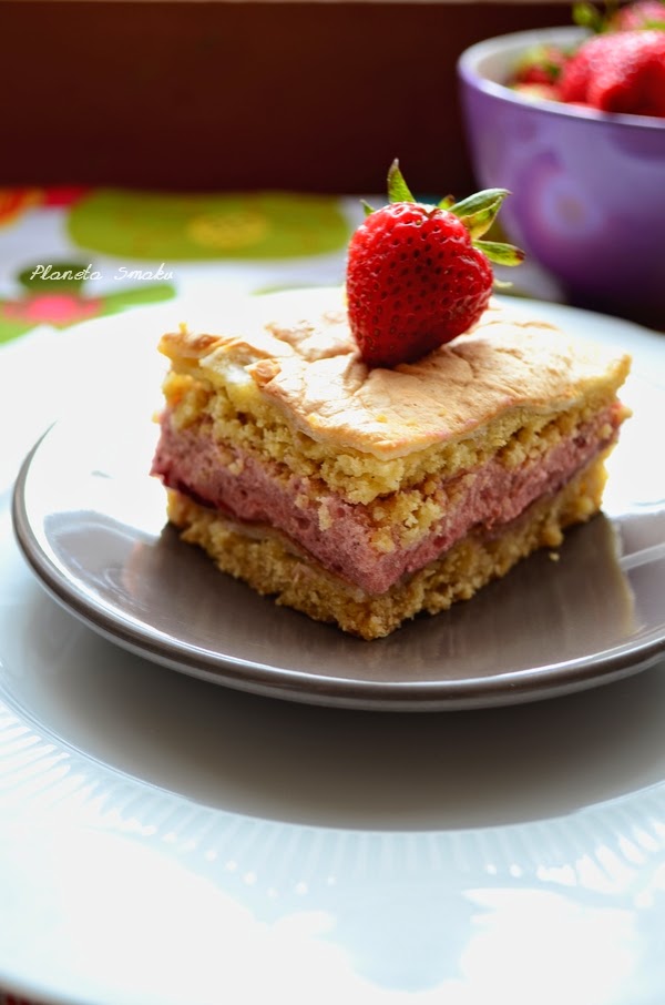 Sezon truskawkowy trwa w najlepsze. Codziennie nowa dostawa tych pysznych owoców sprawia, że muszę szybko realizować swoje pomysły na ich wykorzystanie. W wyszukiwarce po wpisaniu hasła ciasto truskawkowe pojawia się nieskończenie wiele przepisów. Zwykłe ciasto? Jasne, zawsze jest pyszne. Ale czasem przychodzi ochota na mały, kulinarny eksperyment… Dwa kruche placki z bezą, przełożone kremem budyniowym na bazie truskawek. Takiego ciasta jeszcze nie widziałam. Takiego ciasta nie znalazłam do tej pory w wyszukiwarce. Bardzo polecam!
