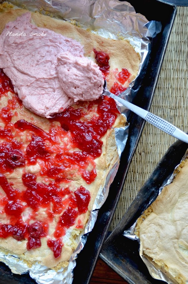 W tym czasie przygotować bezę. Białka ubić ze szczyptą soli na sztywną pianę. Stopniowo dodawać cukier. Gdy piana będzie lśniąca, podzielić ją na pół i posmarować nią oba podpieczone ciasta. Wstawić do piekarnika i piec przez ok. 25-30 minut, aż beza się zrumieni. Po tym czasie wyłączyć piekarnik i pozostawić do całkowitego ostudzenia.