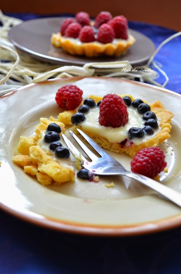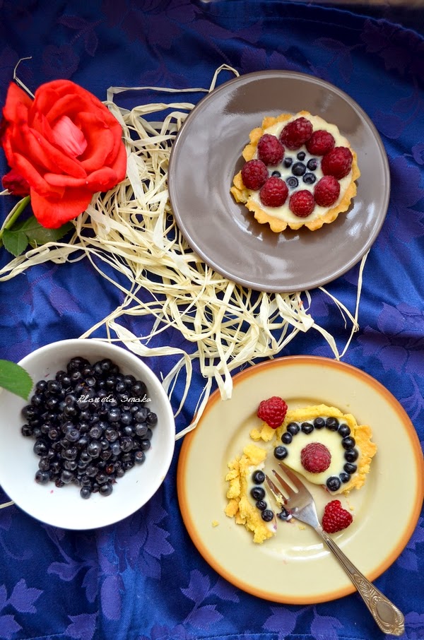 Nadszedł ten cudowny moment w roku, w którym możemy cieszyć się najwspanialszymi owocami lata. Każdego dnia wracam z zakupów z siatką pełną różnokolorowych pyszności. Uwielbiam to! Te pierwsze owoce jem zwykle bez żadnych dodatków, następnie tworzę rozmaite przepisy z ich udziałem. Biała czekolada i maliny? A może biała czekolada i jagody? Dla każdego coś dobrego! A to wszystko na niesamowicie kruchym spodzie. Małe przyjemności, idealne na letni deser.