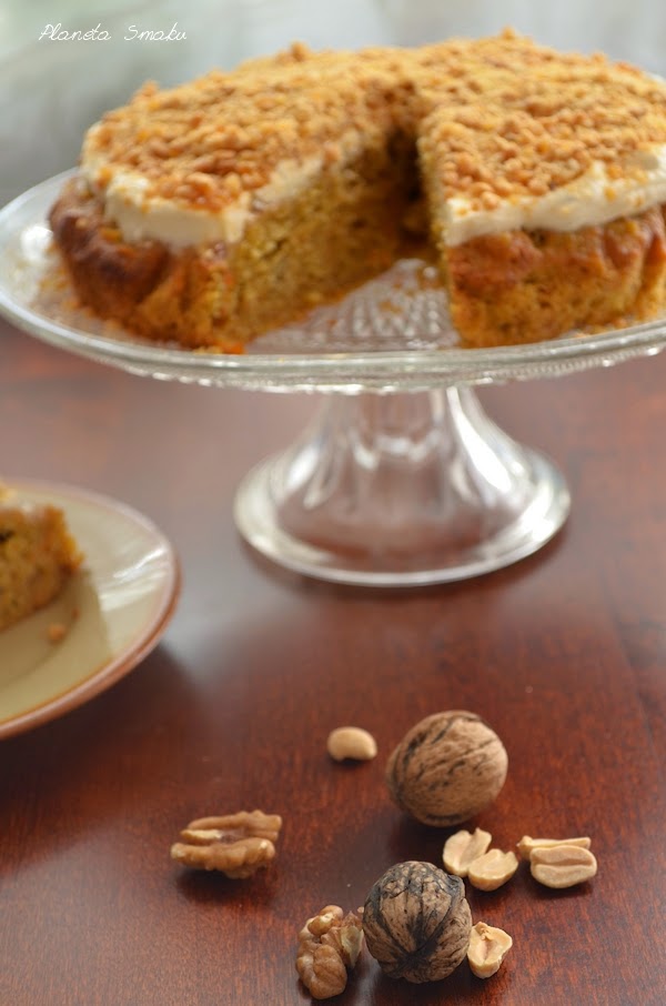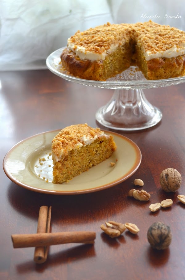 Trochę jesiennie się już zrobiło, chociaż jeszcze nie zapraszam jesieni do rozgoszczenia się u nas na dobre. Pogoda jednak ostatnio nie jest wybitnie letnia, zmuszając mnie do sięgnięcia po grubszy sweter, gdy chcę wyjść z domu. Czy narzekam? Skąd! Wolę udać się do kuchni, wolę upiec ciasto. To nic, że w jesiennym klimacie. Ważne, że jest pyszne i przyjemnie otula swoim korzenno-karmelowym aromatem.