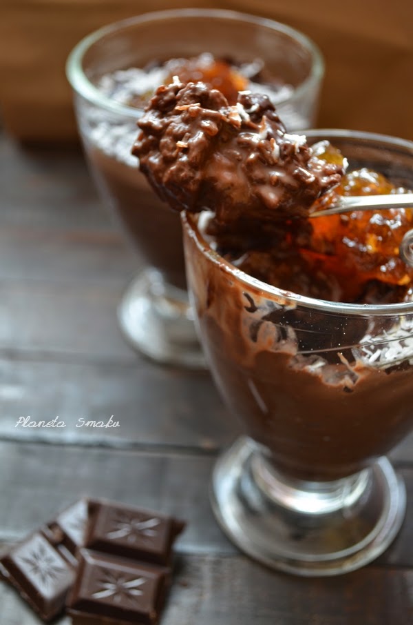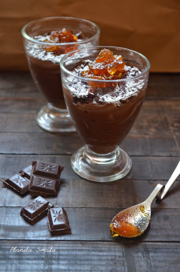Ryż wysypać z torebki, dokładnie opłukać. Mleko zagotować z cukrami i kakao. Wrzucić ryż i często mieszając, gotować, aż ryż będzie miękki i wchłonie większą część mleka. Dodać czekoladę, mieszać aż do jej rozpuszczenia. Dodać śmietankę, wymieszać, aż wszystko się połączy w gładką masę. Risotto przełożyć do pucharków, udekorować wiórkami kokosowymi i marmoladą.