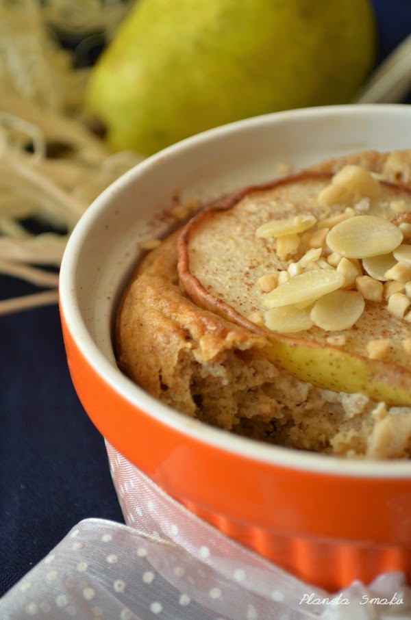 Mąkę wymieszać z proszkiem i szczyptą soli oraz cynamonem, imbirem i gałką muszkatołową. Wbić jajko, dodać jogurt i mus jabłkowy, dobrze wymieszać. Kokilkę wysmarować masłem, przelać do niej ciasto. Ułożyć na wierzchu połowę gruszki, posypać cynamonem i płatkami migdałów. Piec przez 30 minut w 180 stopniach.