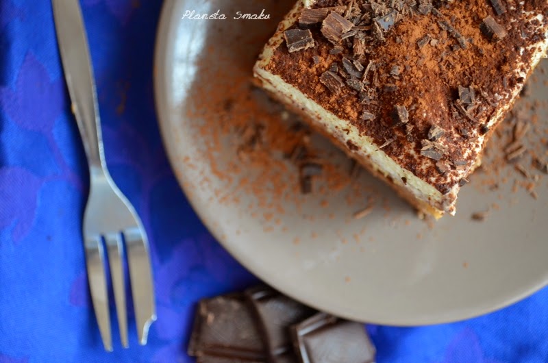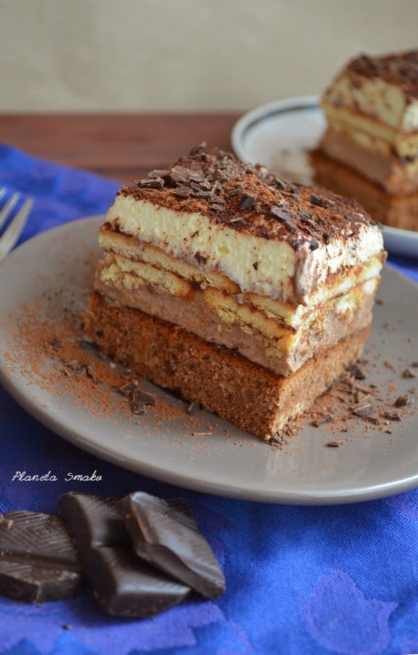 Przed podaniem ciasto oprószyć kakao i wiórkami z czekolady.