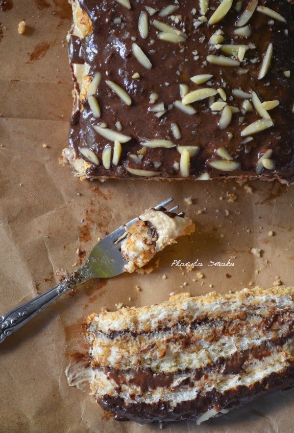 Blaty z orzechowej bezy: Piekarnik nagrzać do 130 stopni. Dużą blaszkę z wyposażenia piekarnika wyłożyć papierem do pieczenia, narysować 3 prostokąty o wymiarach około 27 cm x 13 cm (lub uprościć sobie sprawę i tak jak ja -wyłożyć bezę na blachę, a po upieczeniu podzielić ją ostrym nożem na 3 prostokąty). Zmielić 1 szklankę zrumienionych orzeszków ziemnych z 1/4 szklanki cukru. Resztę orzeszków (1/4 szklanki) posiekać. Białka ubić na pianę razem z octem i solą. Cały czas miksując na dużych obrotach stopniowo dodawać pozostały cukier (1/2 szklanki). Miksować jeszcze kilka minut do czasu aż beza będzie sztywna, gęsta i błyszcząca. Delikatnie wymieszać szpatułką ze zmielonymi i posiekanymi orzeszkami. Wyłożyć na blaszkę, wyrównać powierzchnię i wstawić do piekarnika. Piec na złoty kolor przez około 1 i 1/2 godziny. Wyjąć z piekarnika i ostudzić na kratce (nie zdejmować bezy z papieru).