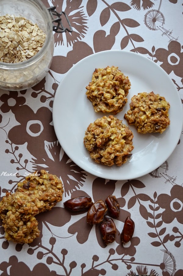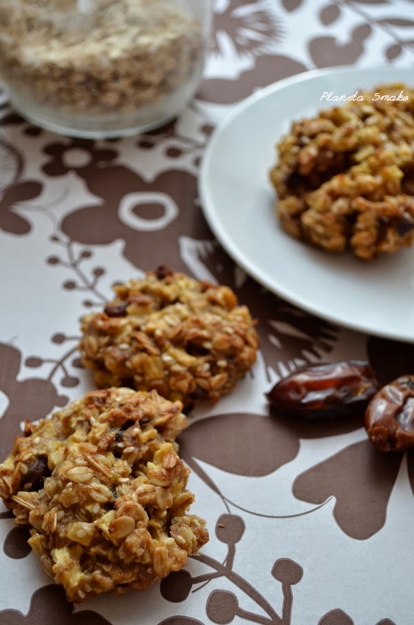 Jabłka umyć i obrać. Pokroić je w bardzo drobną kosteczkę (o boku mniejszym niż 0,5cm). Daktyle drobno posiekać. Płatki owsiane wymieszać z jabłkami, cynamonem, mąką, daktylami, sezamem, mlekiem, miodem i olejem. Masa będzie lepiąca, więc najlepiej formować ciastka wilgotnymi dłońmi. Układać je na wyłożonej papierem do pieczenia blaszce i piec przez około 20 minut w 180 stopniach. Ciepłe ciastka będą miękkie, dopiero później lekko twardnieją – wtedy moim zdaniem są smaczniejsze i bardziej chrupiące.