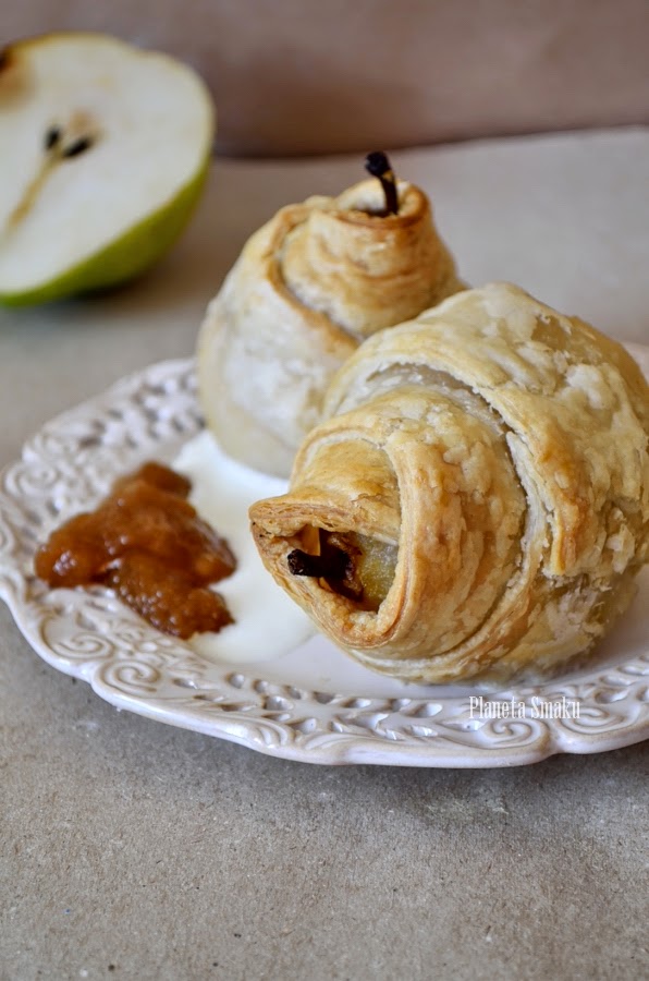 Ciasto francuskie pokroić na paski o grubości ok. 2 cm. Zaczynając od wierzchołka gruszki, owinąć paski ciasta dookoła każdego owoca. Końce zawinąć pod spód gruszek. Owoce w cieście ułożyć na blaszce, wstawić do piekarnika nagrzanego do 190 stopni, piec przez około 25 minut lub do zrumienienia. Podawać z sosem waniliowym lub musem owocowym.