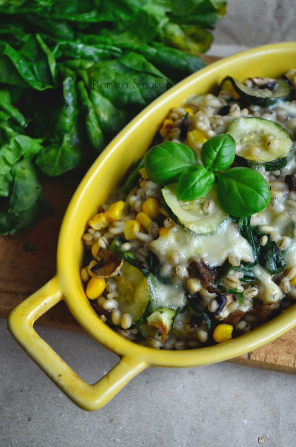 Przepis na dobry obiad? Jak dla mnie to warzywa (najlepiej różnokolorowe!), jakieś dobre węglowodany (najczęściej kasza, ryż lub makaron) no i trochę białka. Jako studentka nauczyłam się przygotowywać szybkie obiady do perfekcji – albo takie, które mogłabym zabrać ze sobą na uczelnię, albo takie, które mogę zjeść w ciągu 15 minut od powrotu do domu. Wszelkie zapiekanki czy naleśniki również wchodzą w grę, ale tylko, kiedy mam więcej czasu wolnego. Tak jak dzisiaj. Przeznaczyłam wolny dzień na zapiekankę z kaszą pęczak, cukinią, pieczarkami, szpinakiem, kurczakiem, kukurydzą i… mozzarellą. Sporo tego, prawda? Ale całość jest taka pyszna, że z pewnością będę takie obiady powtarzać częściej! Polecam. Możecie zrobić taką zapiekankę w mniejszych naczynkach (jak ja), lub przygotować rodzinną porcję w naczyniu żaroodpornym. Od Was zależy forma podania, ja podzielę się treścią 😉