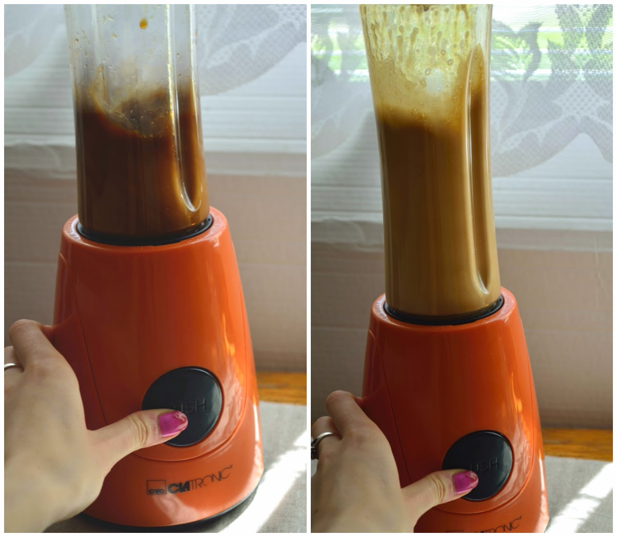 Przyznaję, że duży udział w wynalezieniu tego sposobu miał mój nowy nabytek – smoothie maker. To niepozorne urządzenie przeznaczone do miksowania koktajli idealnie sprawdziło się też w roli coffee makera 😉 Fascynujące jest to, że wystarczy kilka sekund, aby idealnie spienił on kawę. Ja dolewam tylko mleka i cieszę się wspaniałym napojem.