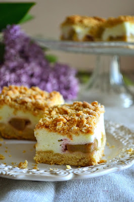 Prostokątną blachę wyłożyć papierem do pieczenia. Na spód zetrzeć na tarce większą część ciasta, lekko przyklepać dłonią i wyrównać. Podpiec na złoty kolor w temperaturze 190ºC przez około 20 minut. Odstawić do całkowitego wystudzenia.