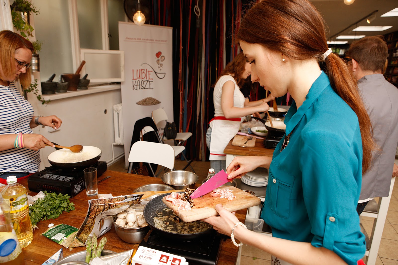 W bardzo przyjemnej, luźnej atmosferze, rozpoczęliśmy warsztaty. Tego dnia królowała kasza, pod każdą postacią – zarówno w deserze, który przygotowaliśmy razem z panem Andrzejem (tu znajdziecie moją wersję), jak i w naszym zadaniu konkursowym. To w końcu główna bohaterka całej kampanii „Lubię Kaszę”, pod którą podpisuję się rękami i nogami. Kasza to bowiem składnik, którego nigdy nie brakuje w mojej kuchni. Już dawno przekonałam się, że można z niej wyczarować prawdziwe kulinarne cuda!