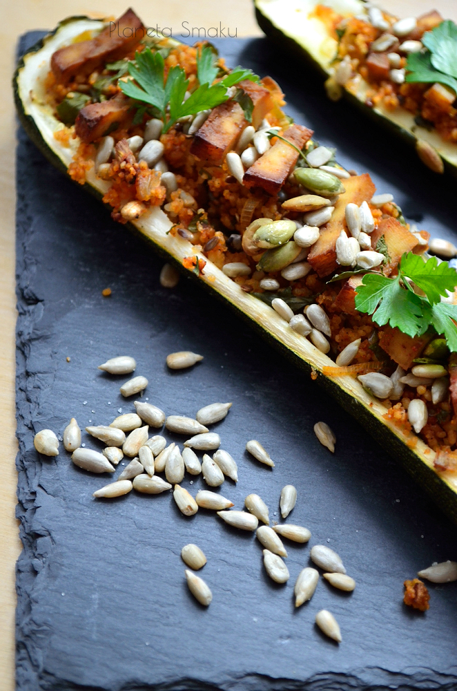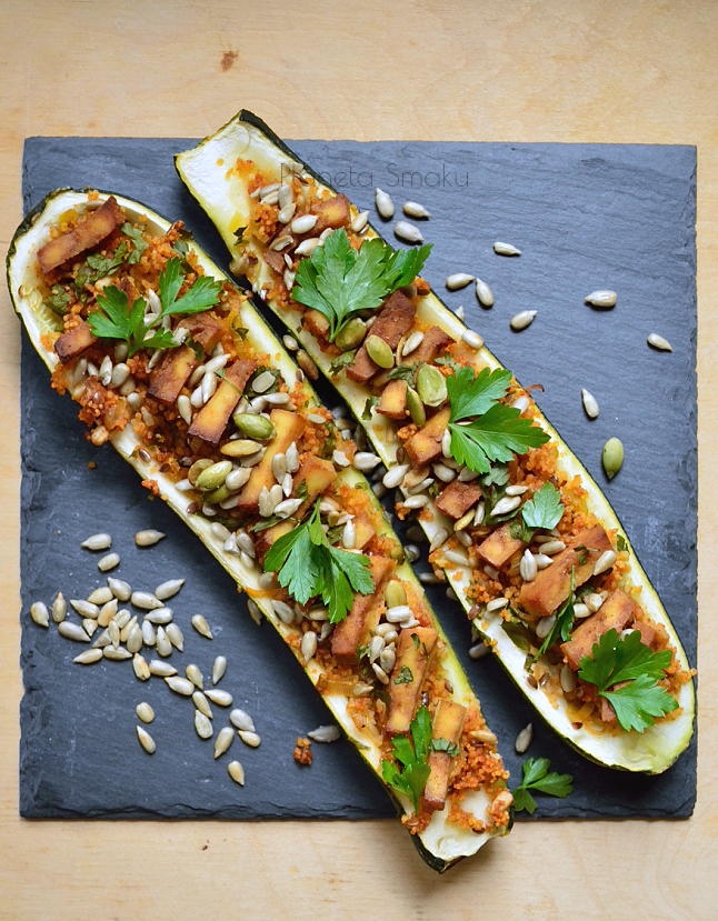Cukinie umyć, osuszyć i przeciąć na pół. Łyżką wydrążyć środki. Nałożyć farsz z kaszy. Tofu wyjąć z zalewy i pokroić w paski. Ułożyć na farszu. Wstawić do piekarnka nagrzanego do 180 stopni i piec przez 30 minut. Upieczoną cukinię posypać podprażonymi na suchej patelni pestkami dyni i słonecznika. Smacznego!