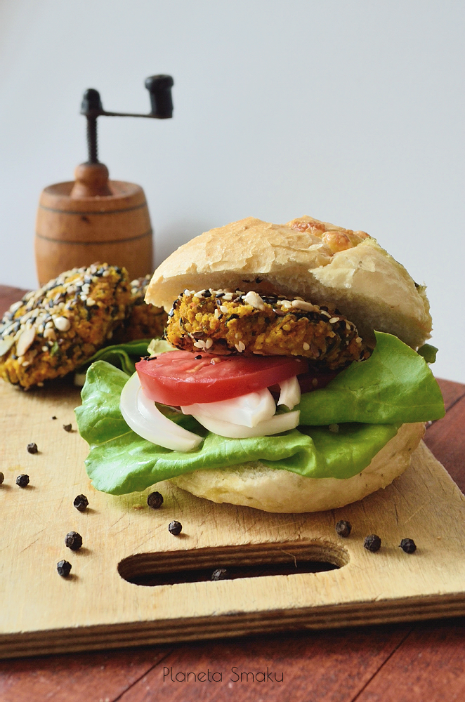 W naczyniu mieszamy ze sobą kaszę, jajko, podsmażoną cebulę z czosnkiem i marchewką, bułkę tartą, mąkę oraz podsmażony szpinak. Dodajemy pozostałe 3 łyżki oleju, masło orzechowe, przyprawiamy i mieszamy wszystkie składniki, aż do ich połączenia. Z powstałej masy formujemy niewielkie kotlety, obtaczamy je w nasionach. Kotleciki układamy na wyłożonej papierem do pieczenia blaszce i wstawiamy do piekarnika rozgrzanego do 180 stopni na około 35 minut, delikatnie obracając je w połowie pieczenia. Burgery podajemy w przekrojonej bułce z ulubionymi dodatkami.