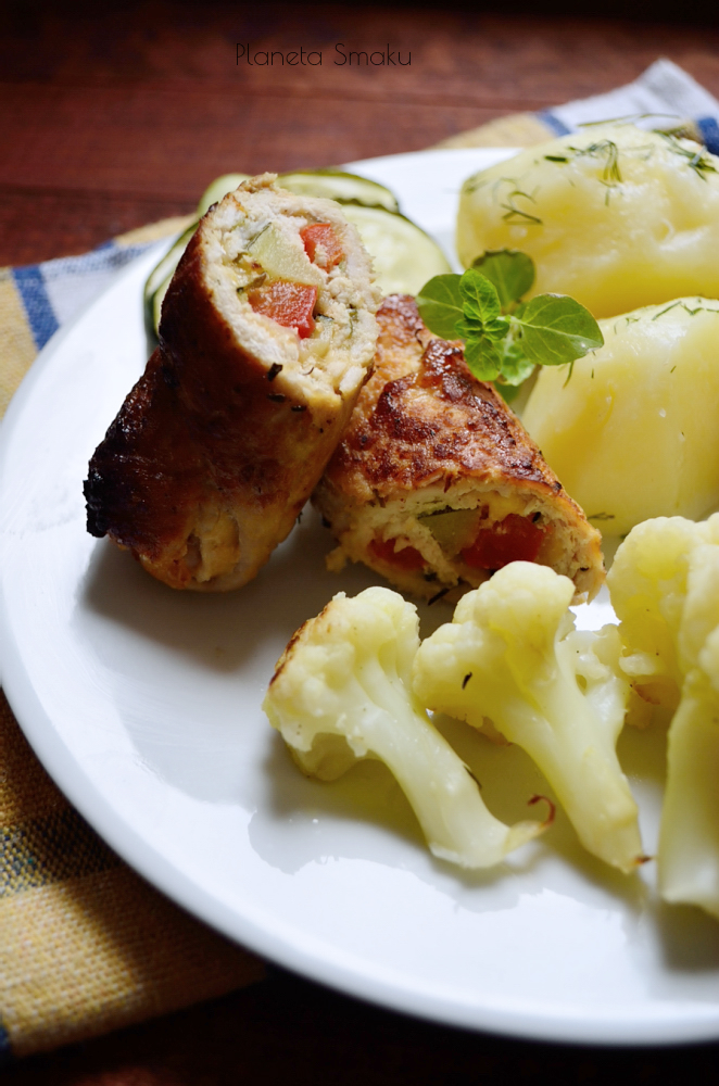 Cukinię pokroić w cienkie plastry i delikatnie posolić. Paprykę pokroić w słupki. Wyjąć zamarynowane kotlety z lodówki, na każdym ułożyć plasterek żółtego sera, kilka plastrów cukinii i kilka słupków papryki. Zwinąć w ciasną roladę. Można spiąć ją wykałaczką, by się nie rozwinęła.