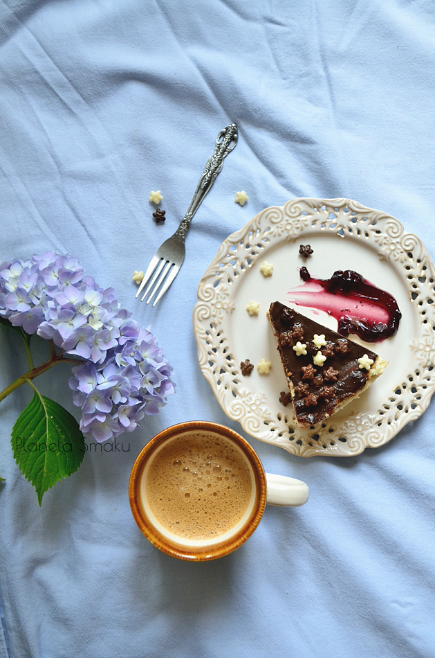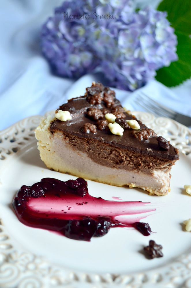 Powiecie pewnie, że dla takiego efektu trzeba zrobić trzy różne masy serowe… Nic bardziej mylnego! Bazą był sernik śmietankowy, do pozostałych dwóch części masy dodałam roztopioną czekoladę i jagodowy mus. Wszystko wyglądało dobrze, jednak przez moją ekonomiczną naturę, postanowiłam w tym samym czasie co sernik, upiec w piekarniku warzywa do obiadu. I z pewnością mogę stwierdzić, że wielokrotne otwieranie drzwiczek piekarnika w czasie pieczenia sernika, to zbrodnia.