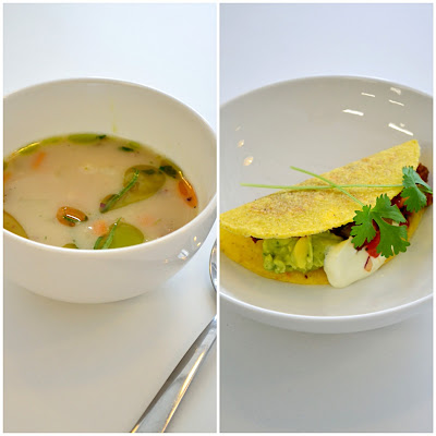 | Bulion wołowy z estragonem i oliwą ziołową Tacos z rwaną wołowiną, guacamole i salsą pomidorową |