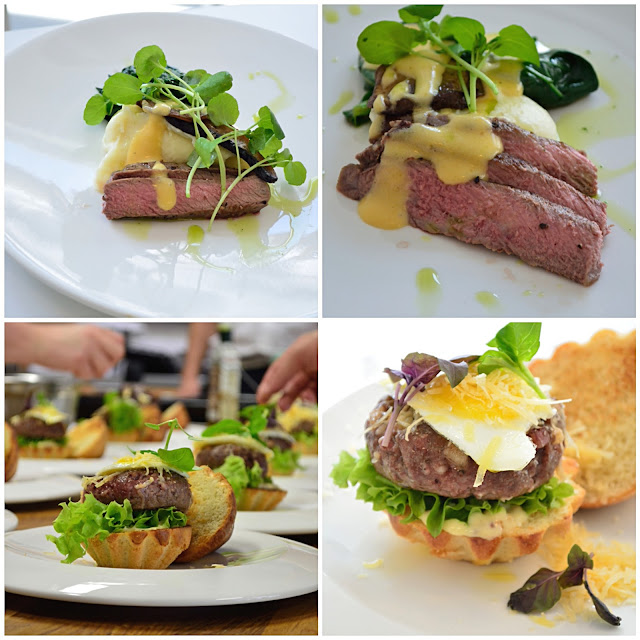 | Rostbef z puree ziemniaczanym, pieczarką portobello, szpinakiem i sosem holenderskim; Bekon burger z jajkiem przepiórczym w maślanej brioche |