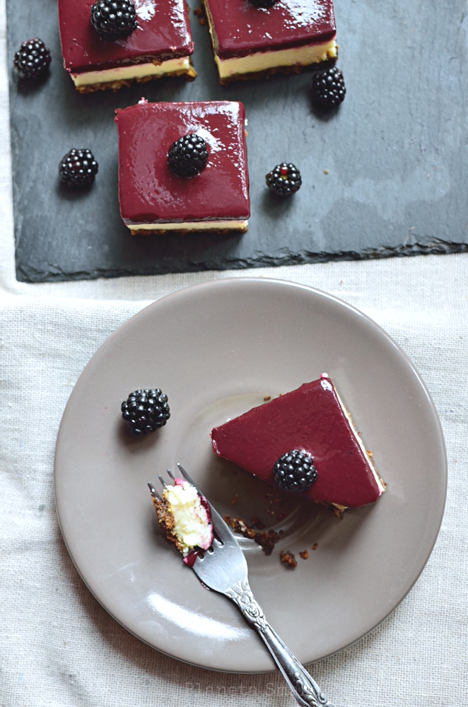 Kroić na kwadraty, ozdobić jeżynami i podawać.