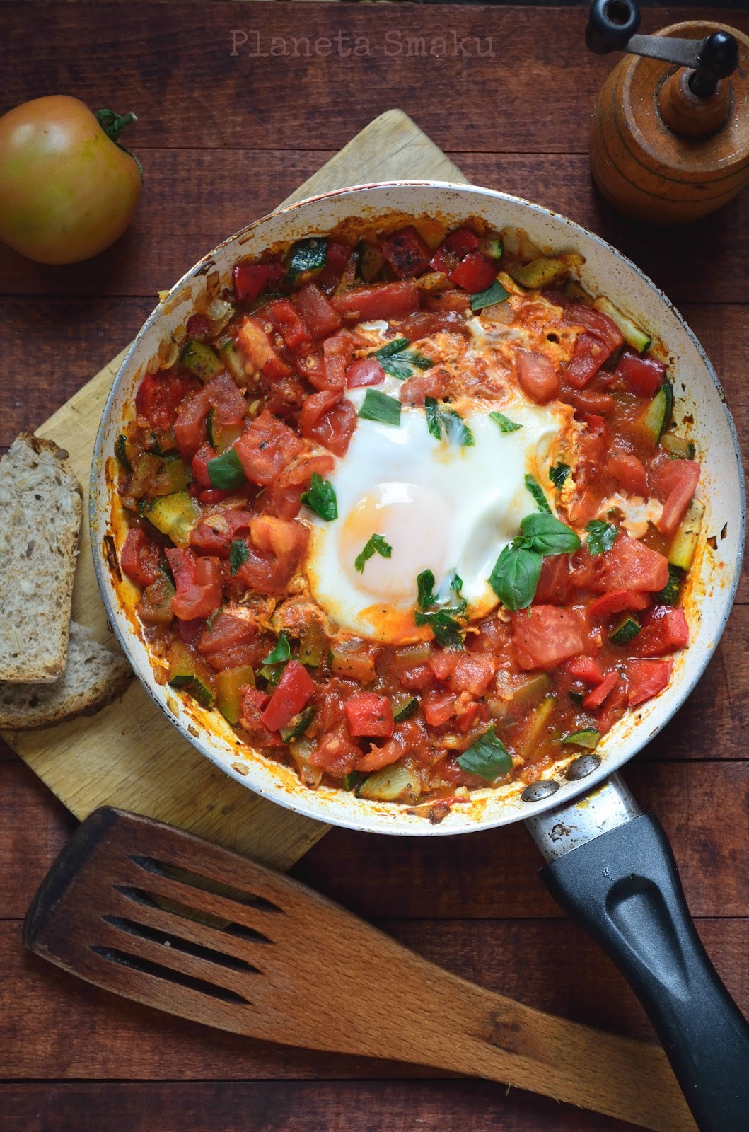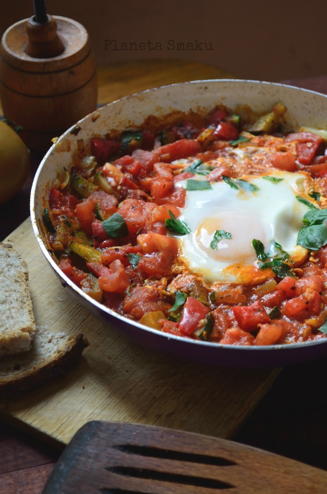 Cebulę pokroić w drobną kostkę i podsmażyć na patelni z rozgrzanym masłem. Dodać pokrojoną w kostkę paprykę i smażyć przez kilka minut, aż papryka zmięknie. Dodać pokrojoną dość drobno cukinię, doprawić solą, pieprzem, kminem i słodką papryką. Pomidora sparzyć i obrać, pokroić w kosteczkę. Na patelnię dodać przeciśnięty ząbek czosnku, smażyć chwilę, po czym dodać pomidory. Dodać szczyptę kurkumy i ewentualnie doprawić do smaku pieprzem i solą. Dusić przez kilka minut, aż pomidory się rozpadną i na patelni zacznie tworzyć się sos. Dodać koncentrat pomidorowy i wymieszać. Ostrożnie wbić jajka (tak, by nie uszkodzić żółtek). Przykryć patelnię pokrywką i dusić przez kilka minut, aż białka się zetną, a żółtka pozostaną płynne. Potrawę posypać porwanymi listkami bazylii. Podawać z pieczywem jako ciepłe danie.