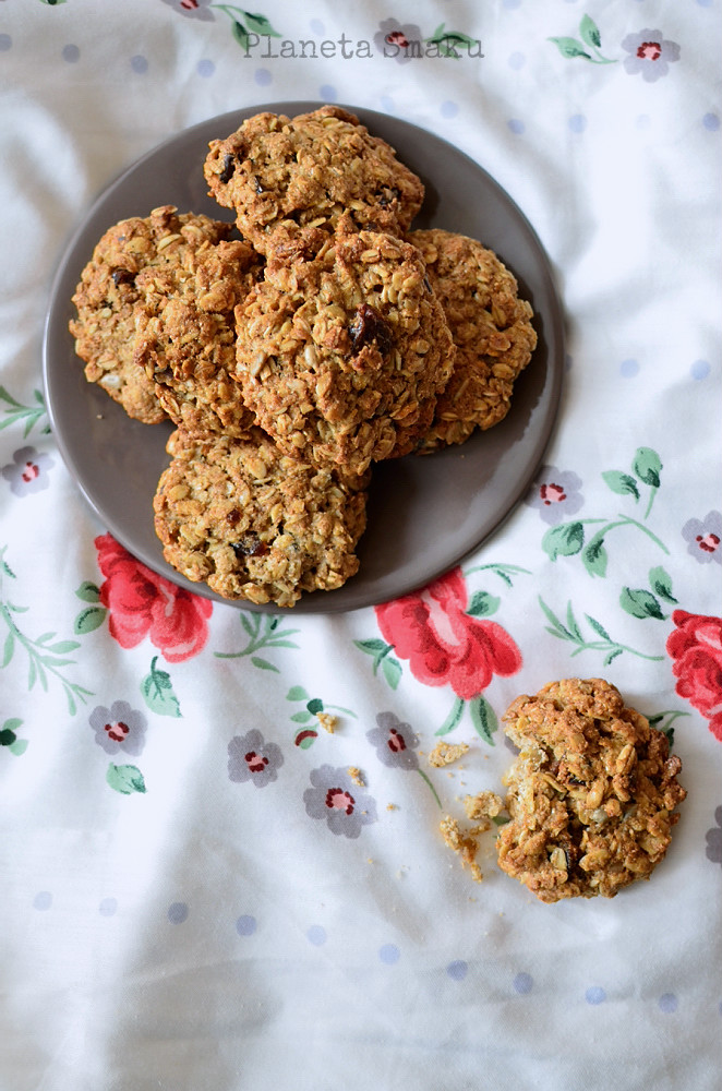 Ciastka owsiane! Kto ich nie lubi? Mają sporo błonnika i innych, zdrowych składników. W moich ukryłam słodkie daktyle, pestki słonecznika i cynamon. Uwaga, trudno się od nich oderwać 😉