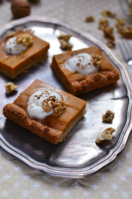 Dynia w wypiekach sprawdza się zaskakująco dobrze. Dodaje pięknego, głębokiego koloru i ciekawego, lekko korzennego i słodkiego smaku, Amerykanie wiedzą, co dobre – Pumpkin Pie jest u nich jednym z najpopularniejszych ciast w okresie jesiennym! Dziś chciałam zaprezentować Wam moją eksperymentalną wersję placka dyniowego – na kruchym, pełnoziarnistym spodzie. Dodatek masła orzechowego do ciasta i oleju z orzechów włoskich do masy sprawiły, że deser ten idealnie nadaje się na jesienne popołudnie. Pycha! 🙂