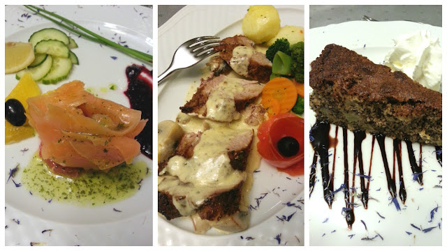 | Przystawka: róża z łososia z cytrusami i sosem porzeczkowym, danie główne: polędwiczki w sosie grzybowym, deser: makowiec z jabłkami |