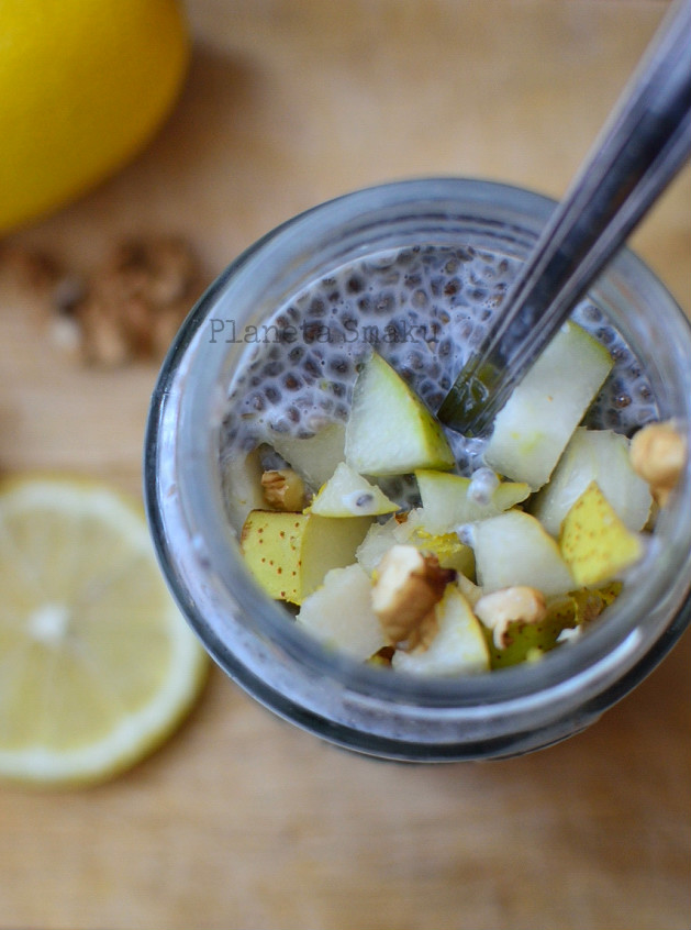 Pierwszy raz po nasiona chia sięgnęłam ponad rok temu. Muszę przyznać, że początkowo kierowała mną najzwyklejsza ciekawość, a fakt, że te tajemnicze nasionka stawały się coraz bardziej „trendy” też pewnie miał wpływ na moją decyzję 😉 Dziś wykorzystuję chia w codziennej diecie i dostrzegam wiele zalet z ich spożywania. Po pierwsze – pudding chia robi się praktycznie sam. Wieczorem wsypujemy nasiona do słoika, zalewamy mlekiem, wstrząsamy i chowamy do lodówki na noc. Tu pojawia się kolejna zaleta, a mianowicie – łatwość w transporcie. Obecnie takie puddingi jadam bardzo często zarówno w pracy, jak i na uczelni. Sycą naprawdę na długo, bo pęcznieją w żołądku. Następna korzyść to neutralność smakowa samych nasion, przez co możemy sami nadać im odpowiedni aromat i smak, stosując ulubione dodatki. Tym razem wykorzystałam cytrynę, gruszkę i orzechy włoskie. Mój pudding wyszedł rewelacyjnie orzeźwiający.