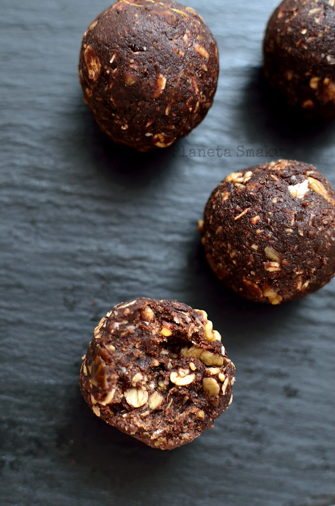 Kuleczki owsiane, słodzone daktylami, wzbogacone o orzechy i kakao. Idealna przekąska dla a) studentów, którzy właśnie zużywają mnóstwo energii na wkuwanie materiału z całego semestru, b) dla sportowców, którzy muszą uzupełnić deficyt kalorii po treningu, c) dla wszystkich tych, którzy chcą zjeść słodką przekąskę, ale dbają o zdrową dietę. Są boskie! A ich zrobienie to żadna filozofia.