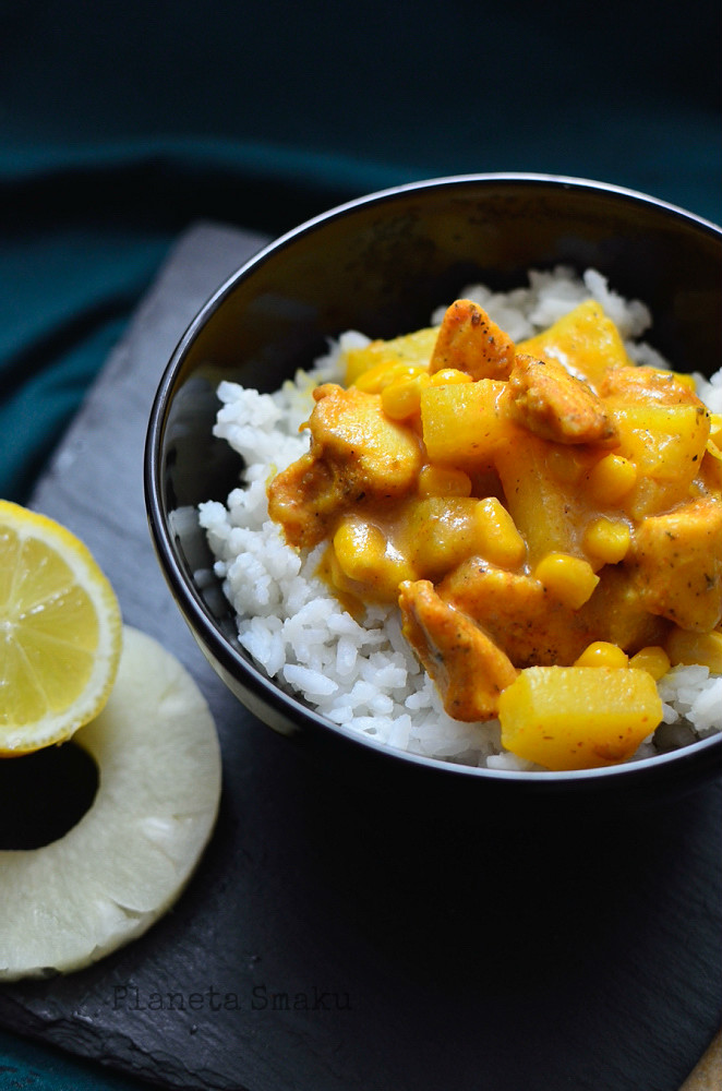 Kurczaka umyć, osuszyć. Pokroić w niewielką kostkę. Przełożyć do miski, dodać przyprawy i sos sojowy, wymieszać. Na patelni rozgrzać olej, dodać kurczaka i smażyć przez kilka minut. Następnie dodać sok z ananasa oraz pokrojone w kostkę ananasy i zmniejszyć ogień. Wodę połączyć z sokiem z cytryny i mąkami, tak, by nie było grudek. Wlać do kurczaka i wymieszać. Dodać miód lub syrop z agawy oraz kukurydzę. Spróbować – ewentualnie doprawić do smaku solą, pieprzem lub odrobiną miodu. Podawać z ryżem.