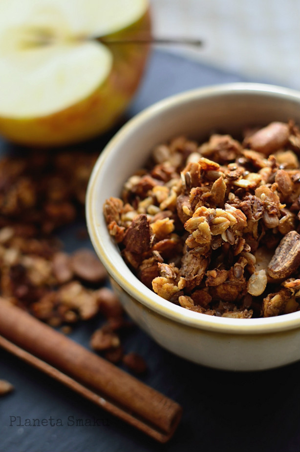 Jabłko umyć i zetrzeć na tarce. Dodać do niego cynamon, masło orzechowe oraz olej, a następnie zblendować na papkę. Wszystkie suche składniki wymieszać, dodać masę jabłkową i dobrze połączyć za pomocą łyżki. Dużą blachę wyłożyć papierem do pieczenia i przełożyć na nią mieszankę owsiano-orzechową. Wstawić do piekarnika nagrzanego do 180 stopni, piec przez około 30 minut, mieszając co 10 minut, aby granola równomiernie się podpiekła (i nie przypaliła). Upieczoną pozostawić do ostudzenia, następnie przełożyć do szczelnego słoika i przechowywać w suchym miejscu przez kilka dni.