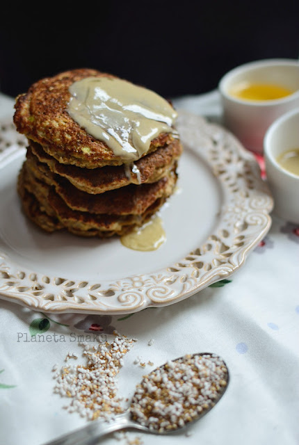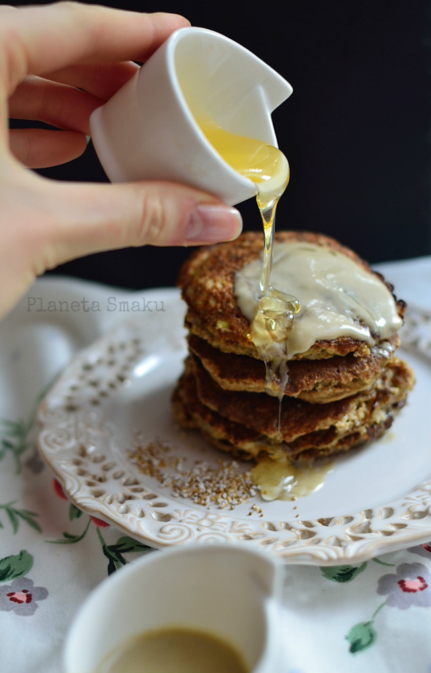 Pomysł na lekkie i zdrowe śniadanie – puszyste placuszki jabłkowe z amarantusem. Są bardzo proste w przygotowaniu – wystarczy chwila, by móc cieszyć się pysznym stosem placków. Polecam podać je z miodem lub innym ulubionym, słodkim dodatkiem, gdyż same placuszki są bardzo delikatne. Ja zakochałam się w połączeniu tahini i miodu – te smaki razem tworzą najlepszy na świecie sos o smaku chałwowym!