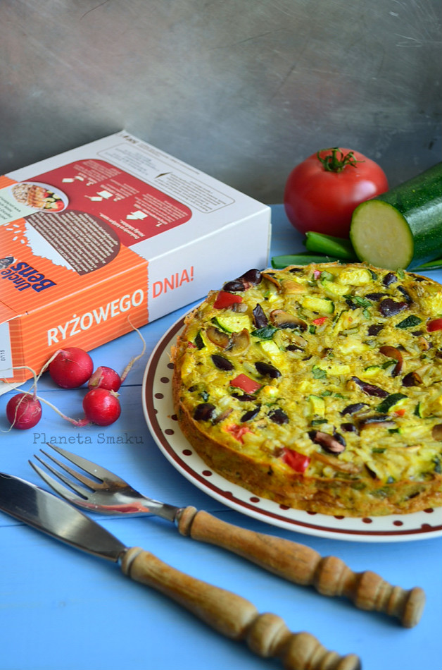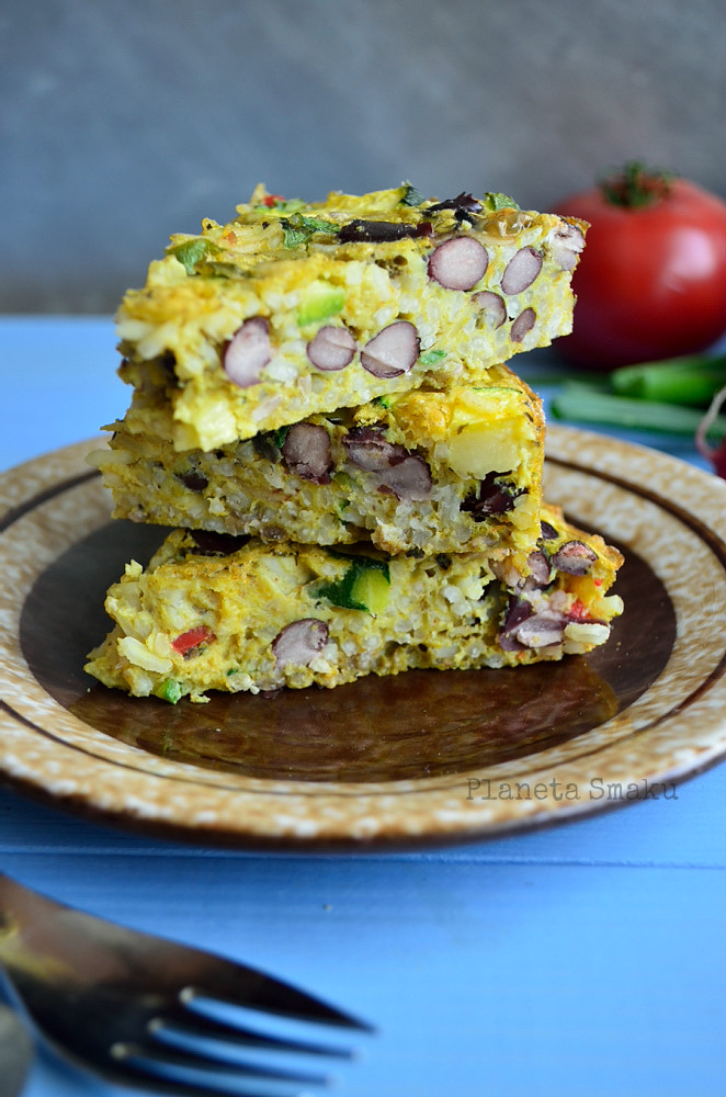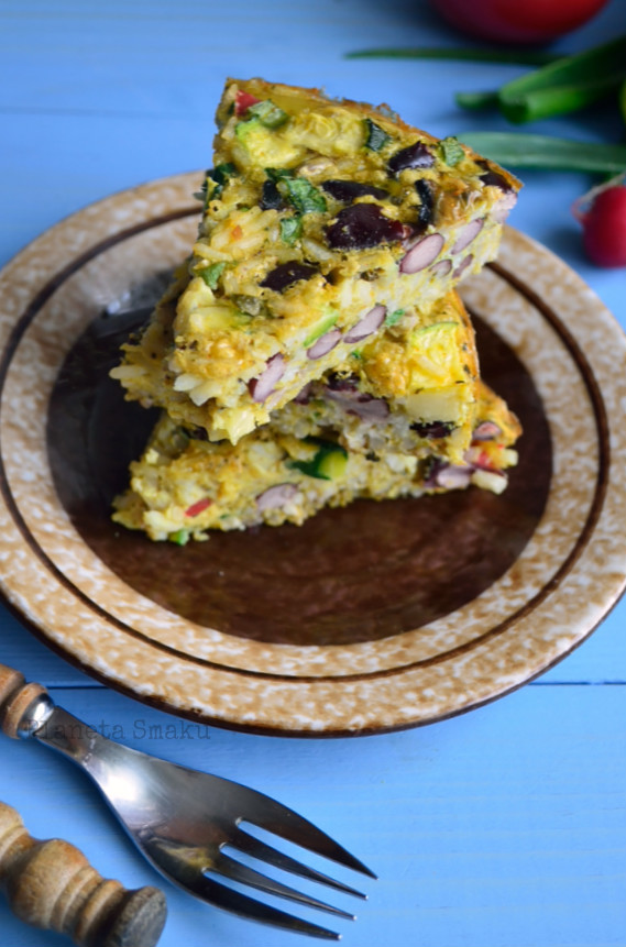 Frittata, czyli rodzaj omletu (często zapiekanego) z różnymi dodatkami, to fantastyczny sposób na wykorzystanie posiadanych akurat składników. Sprawdzi się idealnie zarówno w roli pożywnego śniadania, jak i lekkiej kolacji. Szczególnie, jeśli tak jak ja, dodacie do niej ryż i dużo kolorowych warzyw. Wyszło pysznie, szybko i sycąco!