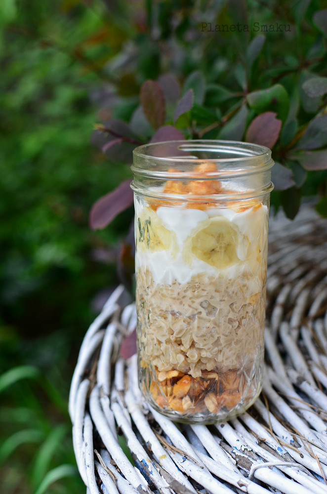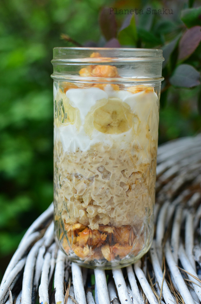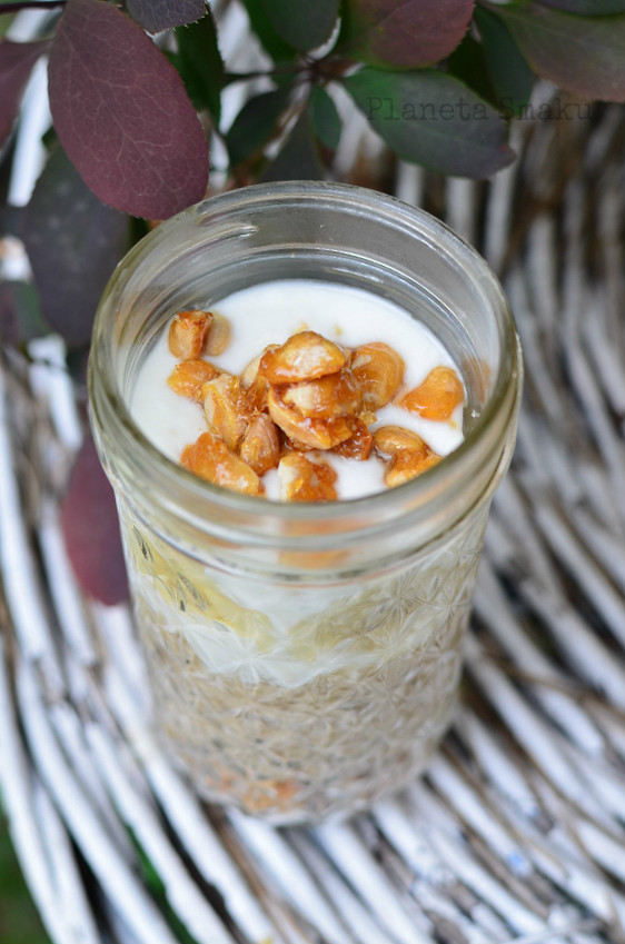 Do wysokiej szklanki lub słoiczka wsypać trochę praliny. Na to wyłożyć połowę masy ryżowej, następnie pokrojonego w plastry banana i polać jogurtem naturalnym. Udekorować praliną orzechową.