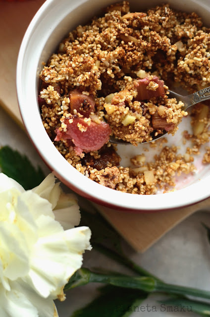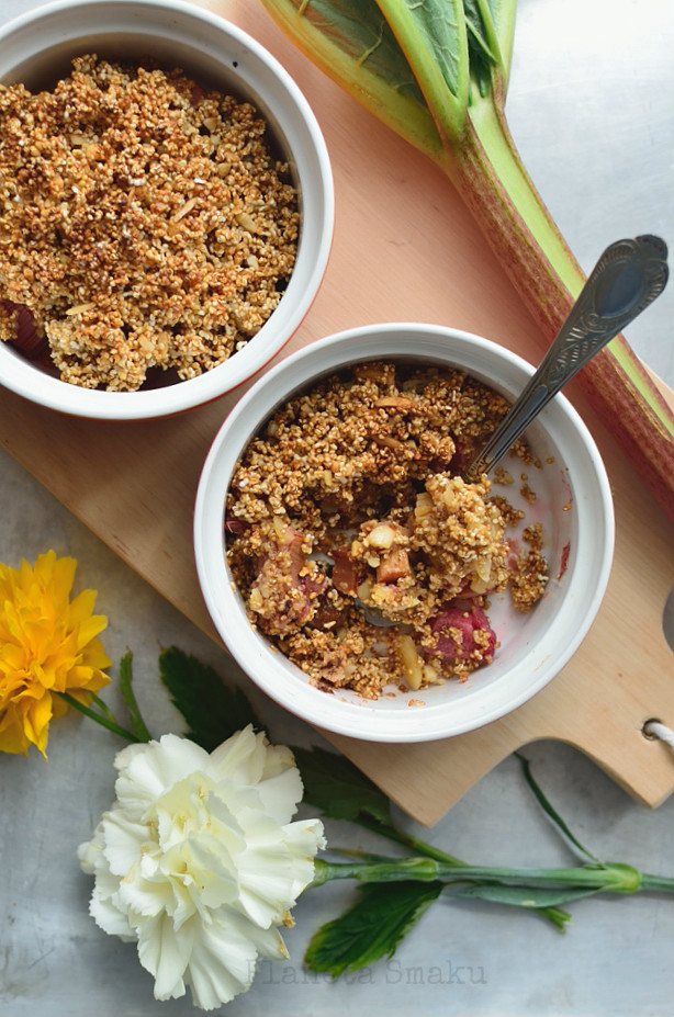 Miałam ochotę na szybki deser. Połączyłam więc ze sobą kilka zdrowych produktów i zapiekłam w formie kruszonki. I wiecie co? Te niepozorne kokilki przekroczyły moje oczekiwania! Amarantusowo-migdałowa kruszonka z rabarbarem okazała się przepyszna. Bez cukru, bez glutenu, bez masła – za to z całą pewnością z pełnią smaku! 🙂 Prosto, sezonowo i zdrowo. Tak, jak lubię najbardziej.