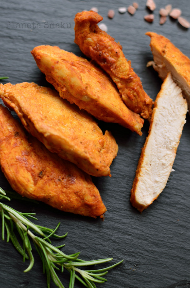 Piekarnik rozgrzać do 190 stopni. Blachę lub brytfankę wyłożyć papierem do pieczenia. Kurczaka wyjąć z lodówki i umieścić na blaszce. Wstawić do piekarnika na około 20 minut, przewracając w połowie pieczenia na drugą stronę. Smacznego!