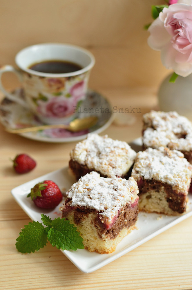 Czasem potrzeba zjedzenia domowego ciasta jest tak silna, że nie czas na kombinacje i wymyślne przepisy. Wtedy sięgam po coś prostego – takiego jak to ciasto śmietankowo-kakaowe z truskawkami i kruszonką. Puszyste, bardzo łatwe w wykonaniu, lekko wilgotne. W sam raz na rodzinny deser.