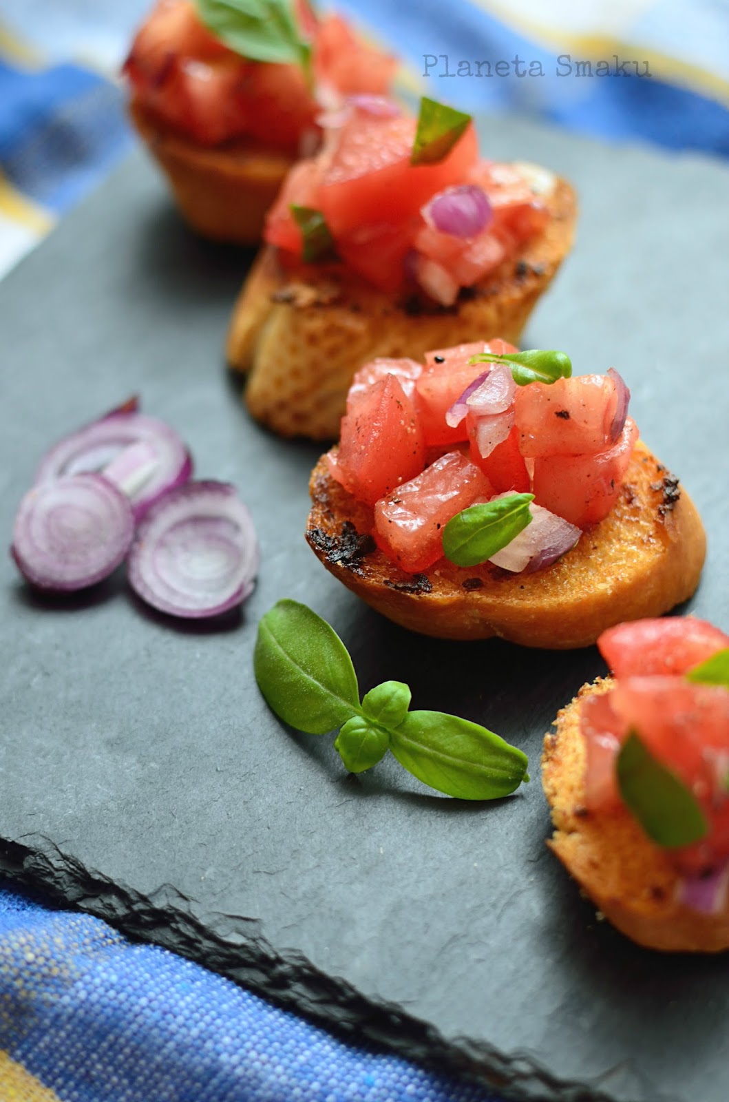 Pomidora zalewamy wrzątkiem, zdejmujemy skórkę. Kroimy na plastry, wyjmujemy miąższ z pestkami, a resztę kroimy w drobną kostkę. Przekładamy ją do miski, doprawiamy pieprzem, solą, posiekaną bazylią, octem balsamicznym i łyżką oliwy. Mieszamy. Nakładamy pomidory na zrumienioną bagietkę, po czym wstawiamy do piekarnika jeszcze na kilka minut.