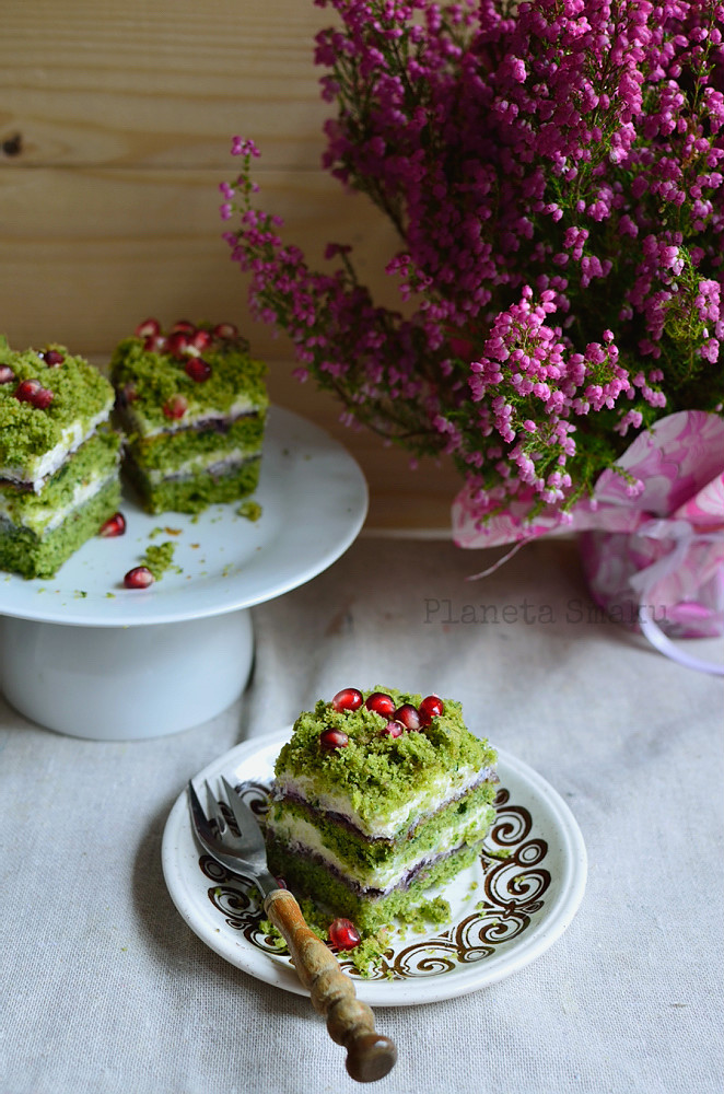 Wspominałam ostatnio na Facebooku, że moja mama z okazji urodzin poprosiła mnie nie o zwyczajny tort, tylko o.. ciasto szpinakowe. Zgodziłam się, bo przecież mamie się nie odmawia 😉 A prawda jest taka że sama bardzo lubię to zielone ciasto! Nie przesadzę, jeśli powiem, że piekłam go już kilkanaście razy (głównie na zamówienie). Tym razem przedstawiam wersję, w której szpinakowe ciasto połączyłam z bardzo delikatnym kremem na bazie mascarpone, bitej śmietany i białej czekolady. Żeby nie było zbyt słodko, całość przełamana jest kwaśnym dżemem z czarnej porzeczki i owocami granatu. Na blogu jest już inna wersja ciasta leśny mech, jednak tym razem spokojnie może on występować w roli tortu – jest bardziej elegancki i – moim zdaniem – jeszcze lepszy w smaku! Można zrobić go zarówno w tortownicy, jak i w prostokątnej formie. Za każdym razem zachwyca gości.