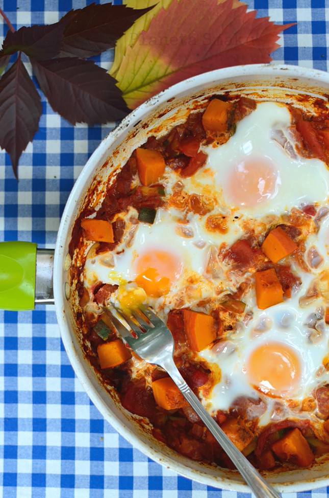 Początek jesieni to doskonały czas na rozgrzewające i sycące śniadania. To także czas na to, aby zakupić dynię, upiec ją i wykorzystywać w swojej kuchni na wiele różnych sposobów. Jednym z nich jest szakszuka. Kompletnie zakochałam się w tej potrawie, przez co zjadam ją średnio 3 razy w tygodniu! Uwielbiam to połączenie żółtek rozpływających się w pomidorowym sosie. Lubię zarówno wersję standardową, jak i wariacje na jej temat. Wersja z pieczoną dynią bardzo mi posmakowała. Jest sycąca, kolorowa, rozgrzewająca. Jesienna 🙂 Upieczcie więc następnym razem nieco więcej dyni i zostawcie kawałek do śniadania!