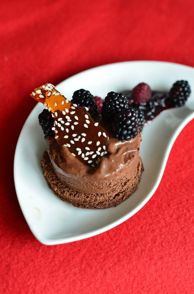 Deser – czekoladowe parfait na biszkopcie z owocami leśnymi i karmelową praliną.