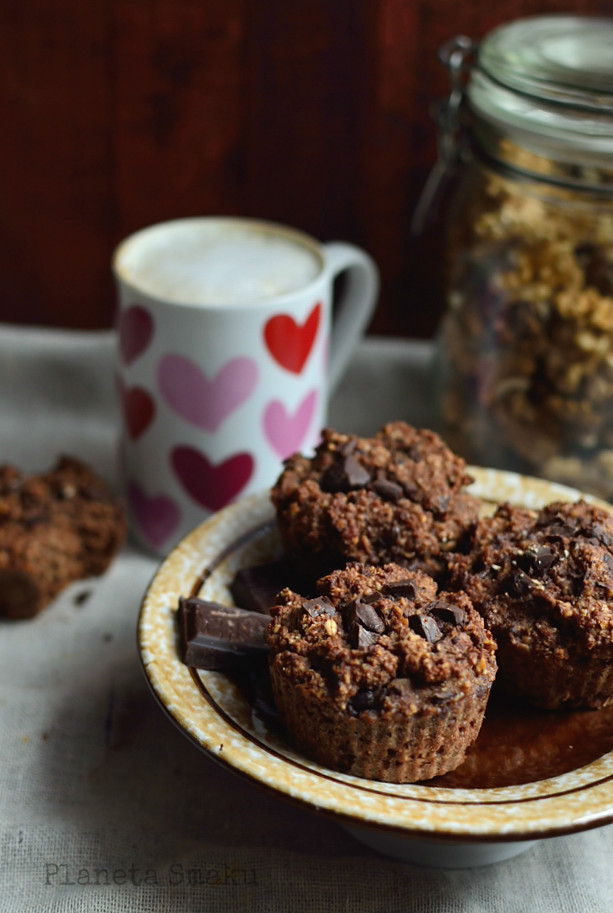 Orzechy i płatki owsiane zmielić w blenderze na mąkę. Wymieszać z mąką kokosową, kakao, karobem i cukrem lub ksylitolem. W osobnej misce połączyć mokre składniki – mus jabłkowy, olej, mleko, jaja. Mokre składniki wlać do suchych i dobrze wymieszać (można to zrobić łyżką lub mikserem). Czekoladę posiekać nożem i wmieszać do ciasta (można też odłożyć nieco czekolady i posypać nią wierzch muffinek). Ciasto przełożyć do przygotowanych papilotek – silikonowych lub papierowych. Piec przez około 25 minut w 170 stopniach.
