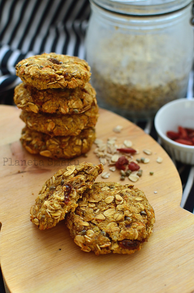 Dziś mam dla Was przepis na marchewkowe ciastka owsiane. Na blogu były już gofry marchewkowe, teraz pora na chrupiące ciastka z dodatkiem marchewki 🙂 W okresie przed sesją zawsze odczuwam zwiększone zapotrzebowanie na energetyczne przekąski. Staram się jednak nie ulegać sklepowym pokusom i wybieram zdrowe, własnoręcznie upieczone ciastka. Te marchewkowe są super! Nie tylko pod względem smaku, ale też właściwości odżywczych! Oprócz płatków owsianych dodałam do nich bowiem daktyle, jagody goji i nasiona konopii. Te superdodatki bez problemu można dostać teraz w większości sklepów na dziale ze zdrową żywnością – warto po nie sięgnąć 🙂 Oczywiście nie są one konieczne, można je pominąć lub zastąpić ulubionymi bakaliami. Polecam te ciastka nie tylko studentom – to idealna, zdrowa przekąska bez dodatku cukru. Inspiracja: zielony środek