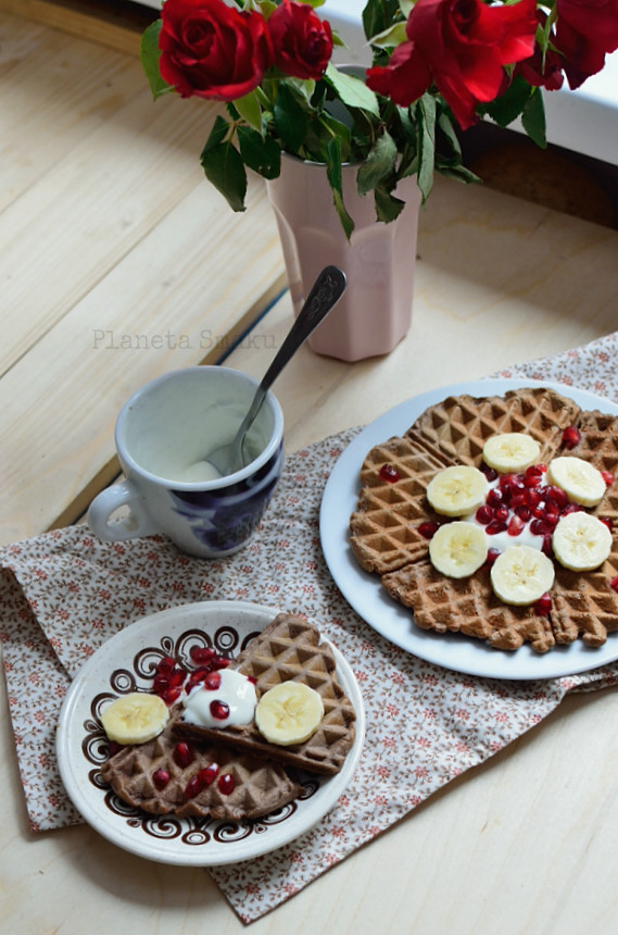 Kolejny przepis na zdrowe gofry, które przygotowałam na leniwe, urodzinowe śniadanie 🙂 Chrupiące, owsiano-jaglane, z dodatkiem kakao. Podane z białym serkiem, granatem i bananem. Ach, takie śniadania mogłabym jeść codziennie 🙂