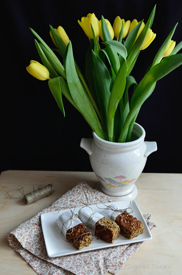 Keksówkę wyłożyć papierem do pieczenia. Masę przełożyć do foremki, dociskając ją do brzegów i wyrównując wierzch. Wstawić do piekarnika na około 20 minut. Piec w 180 stopniach. Ostudzić i pokroić na batony. Przechowywać najlepiej w szczelnym, szklanym pojemniku przez kilka dni.