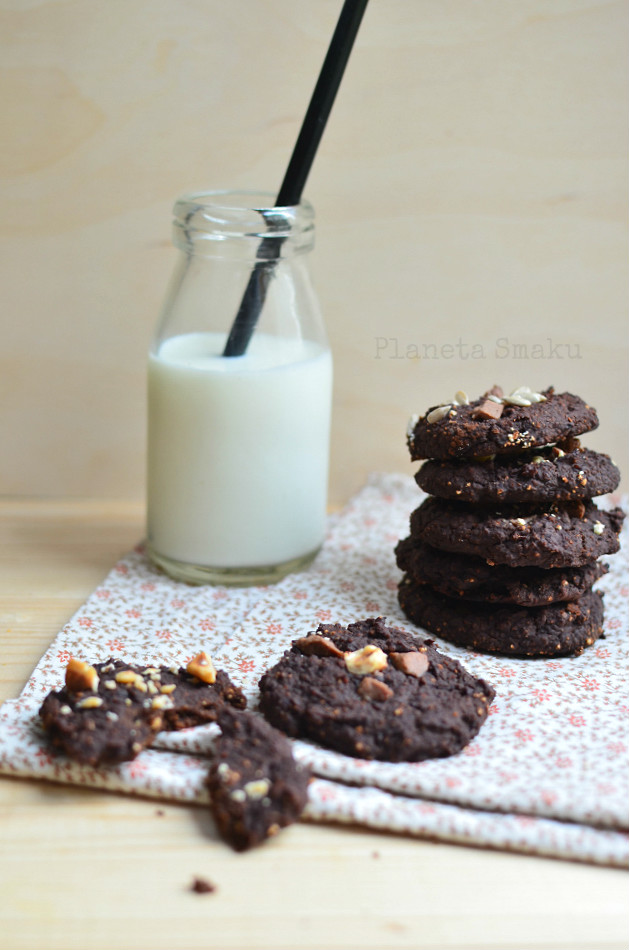 Blachę wyłożyć papierem do pieczenia. Nakładać po łyżce ciasta, formując okrągłe ciasteczka. Przed pieczeniem można dodatkowo posypać je orzeszkami lub czekoladą. Wstawić do piekarnika nagrzanego do 180 stopni i piec przez około 20 minut. Mogą po tym czasie być jeszcze lekko miękkie – po ostudzeniu lekko stwardnieją.